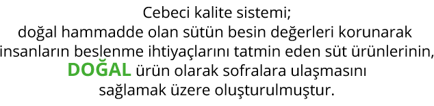 Cebeci süt ürünleri tamamen hava ile temas etmeyen ortamlarda hijyenik ve standartlara uygun ürünler üretilmektedir. Havasız ortam, hava ve oksijen ile çoğalan mikroorganizmaların yaşamasına imkân vermemektedir. Saklama koşullarına uyulduğu takdirde raf ömrü boyunca ürünler tazeliğini korur.